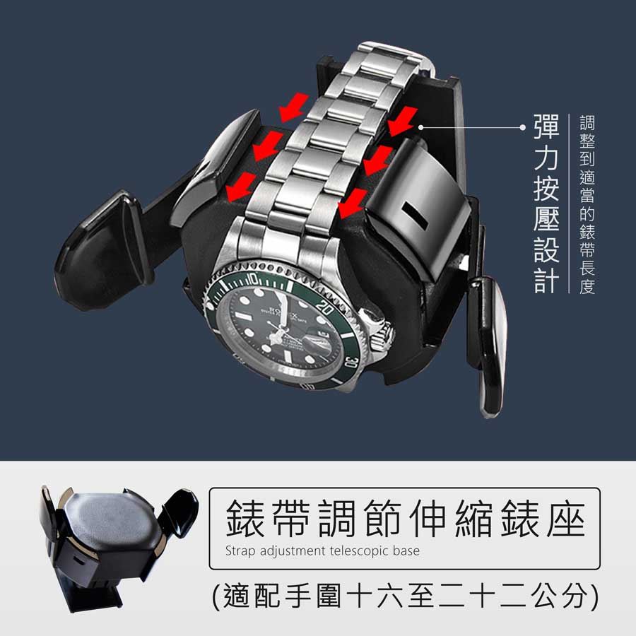 錶座:獨家專利,圓形錶座,可360度無死角嵌入。按壓伸縮結構設計,可放置錶圍更廣。