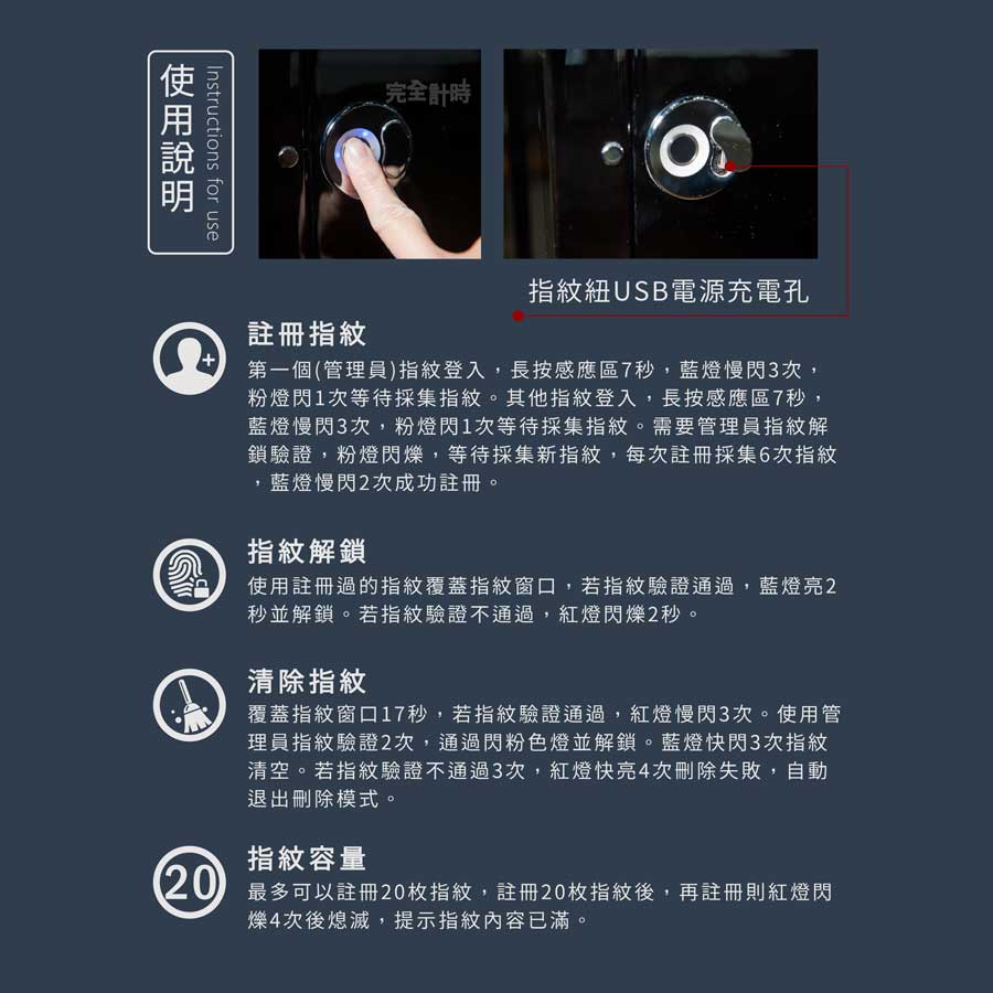 本款商品指紋鎖部分為獨立蓄電系統,需使用梯形充電器,每半個月進行一次充電